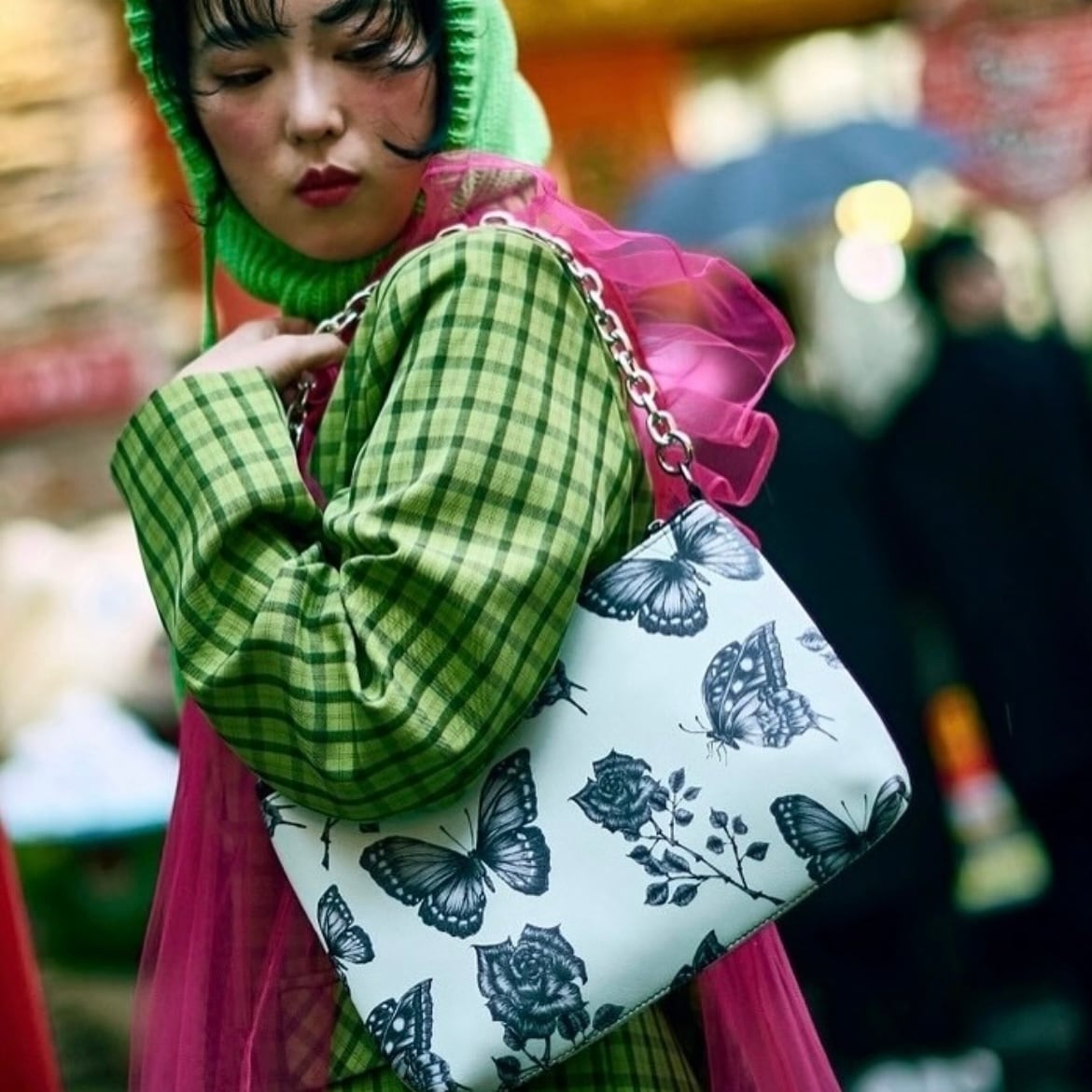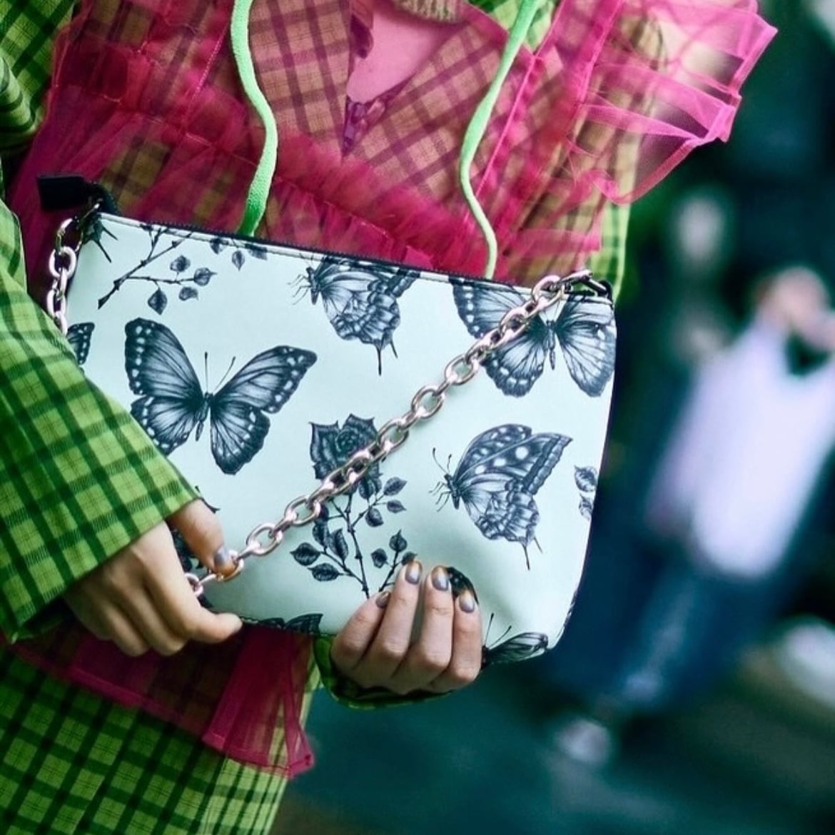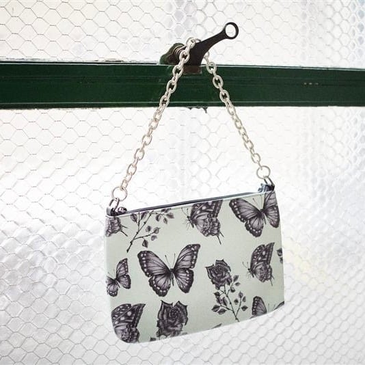 クラシックなシルエットが特徴のオリジナルショルダーバッグ。蝶と薔薇柄が美しいスタイリッシュなデザイン。