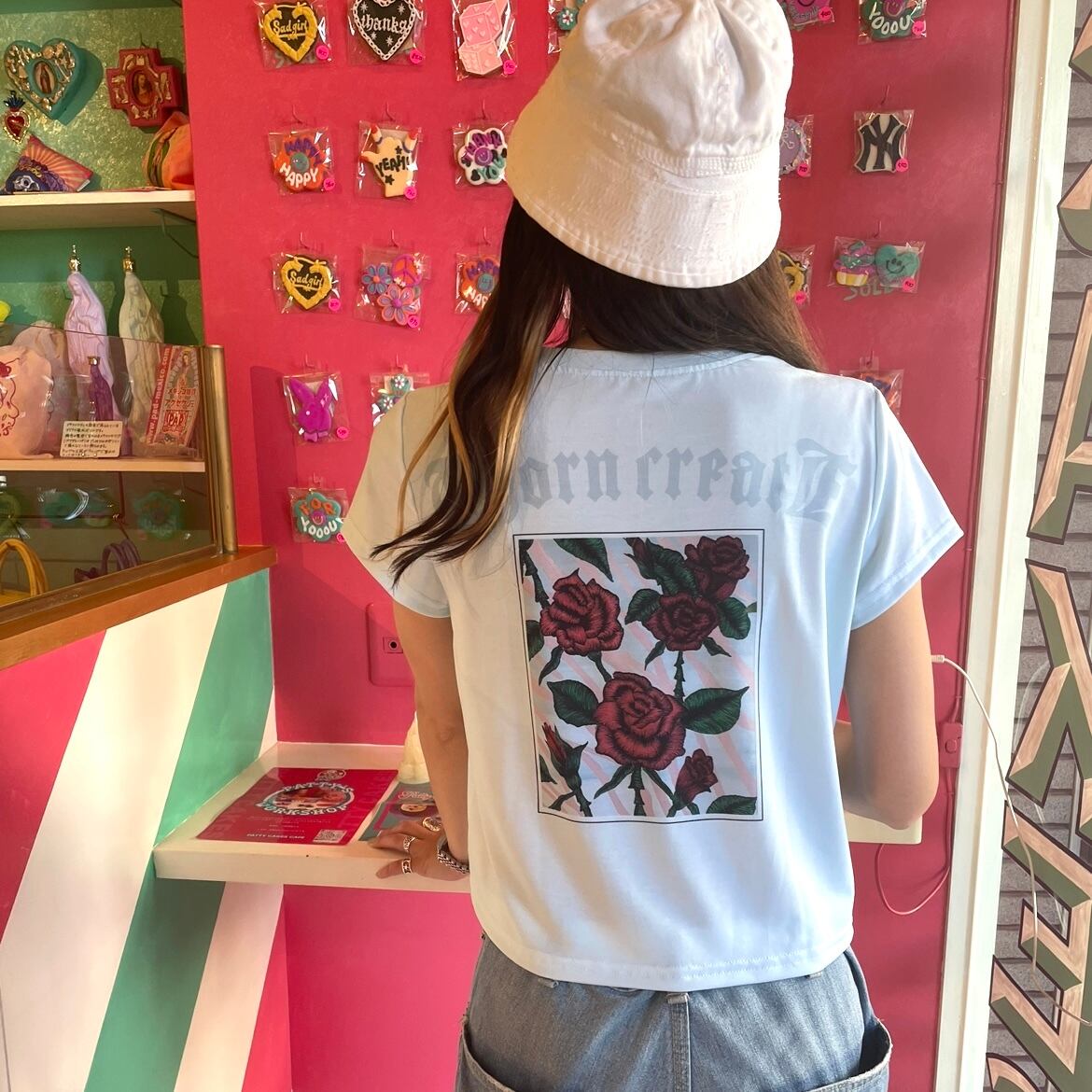 バックに大きくバラモチーフをデザインしあクロップTシャツ。