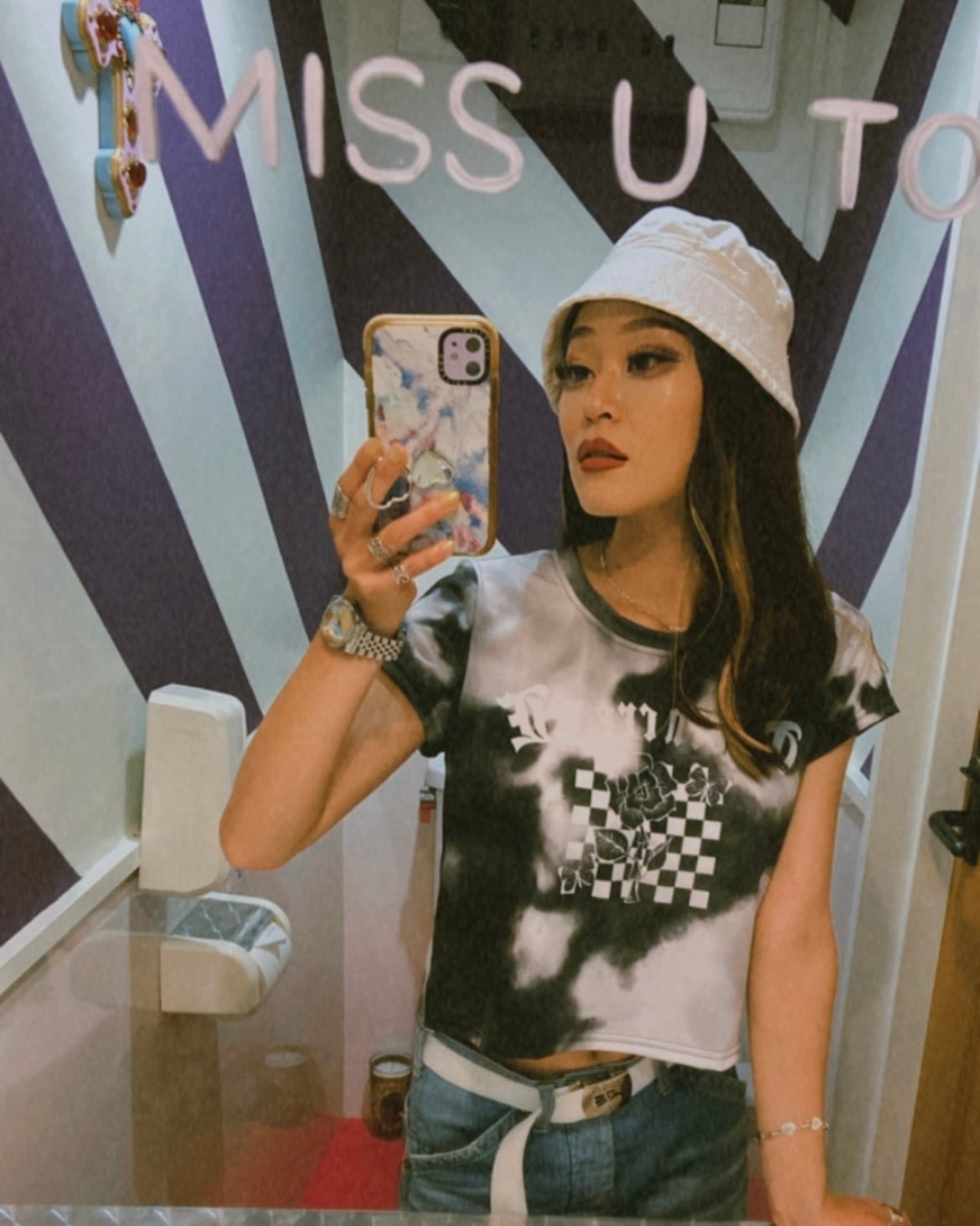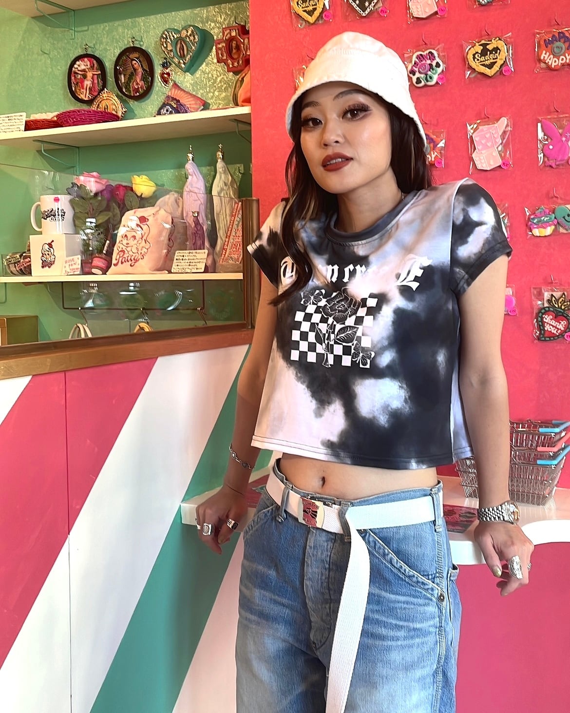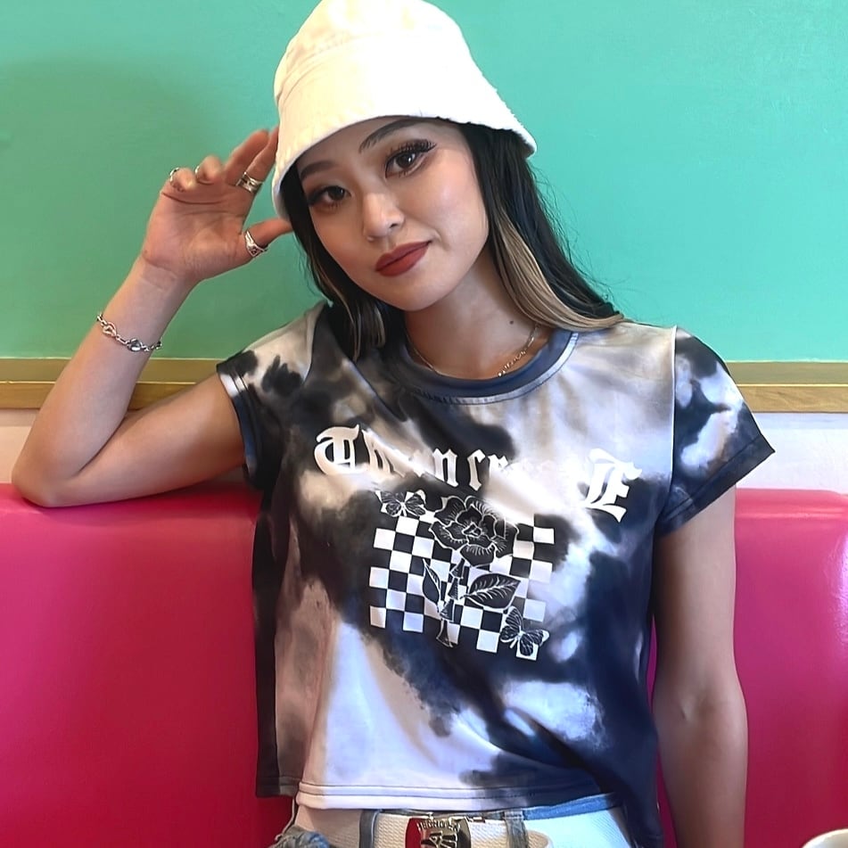 ブラックのタイダイ柄にバラと蝶デザインを施したオリジナルのクロップTシャツ。