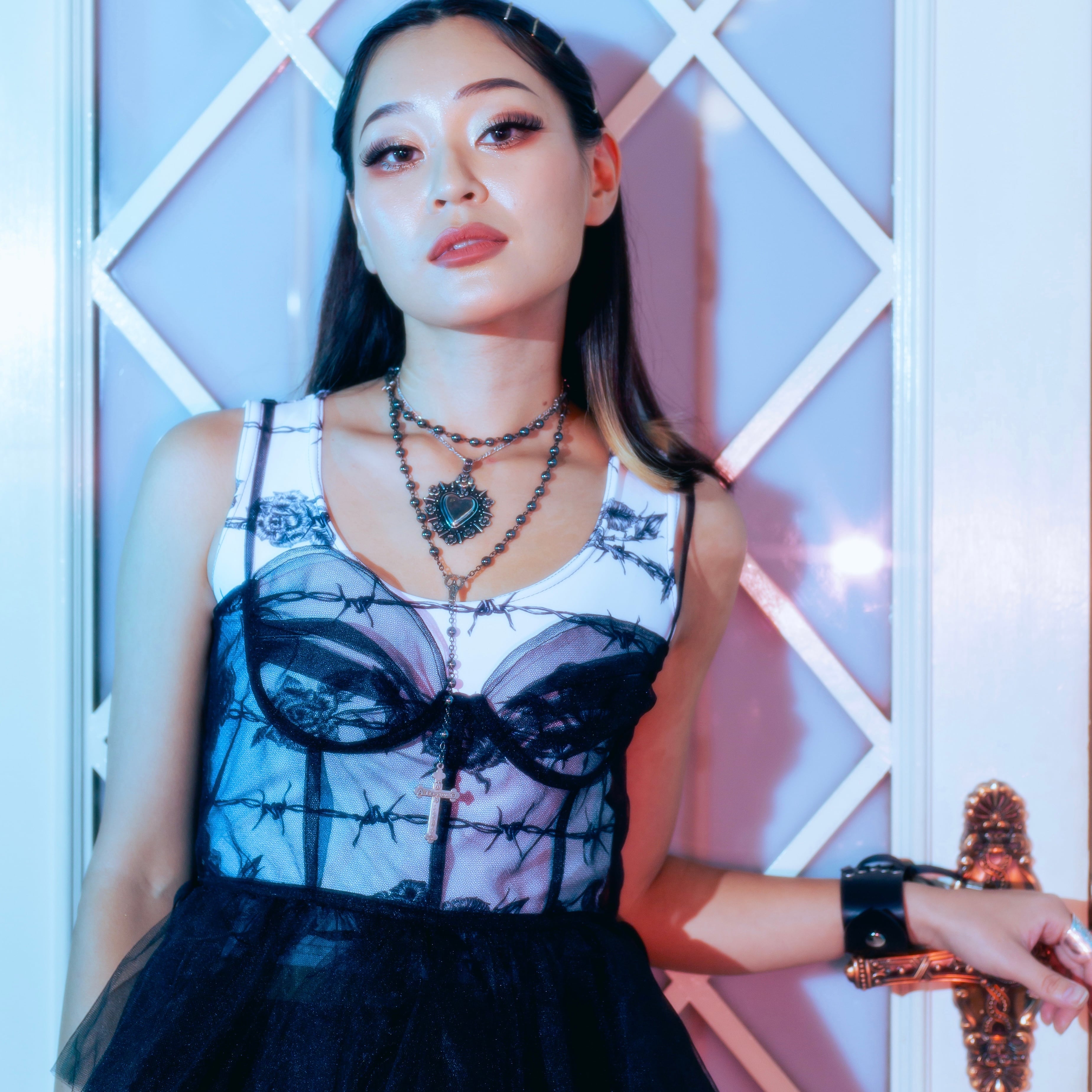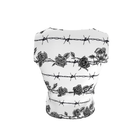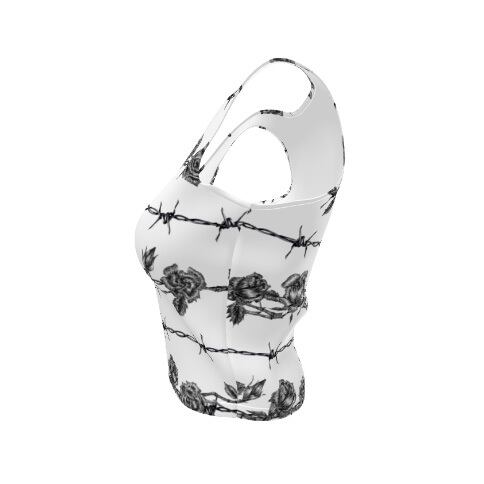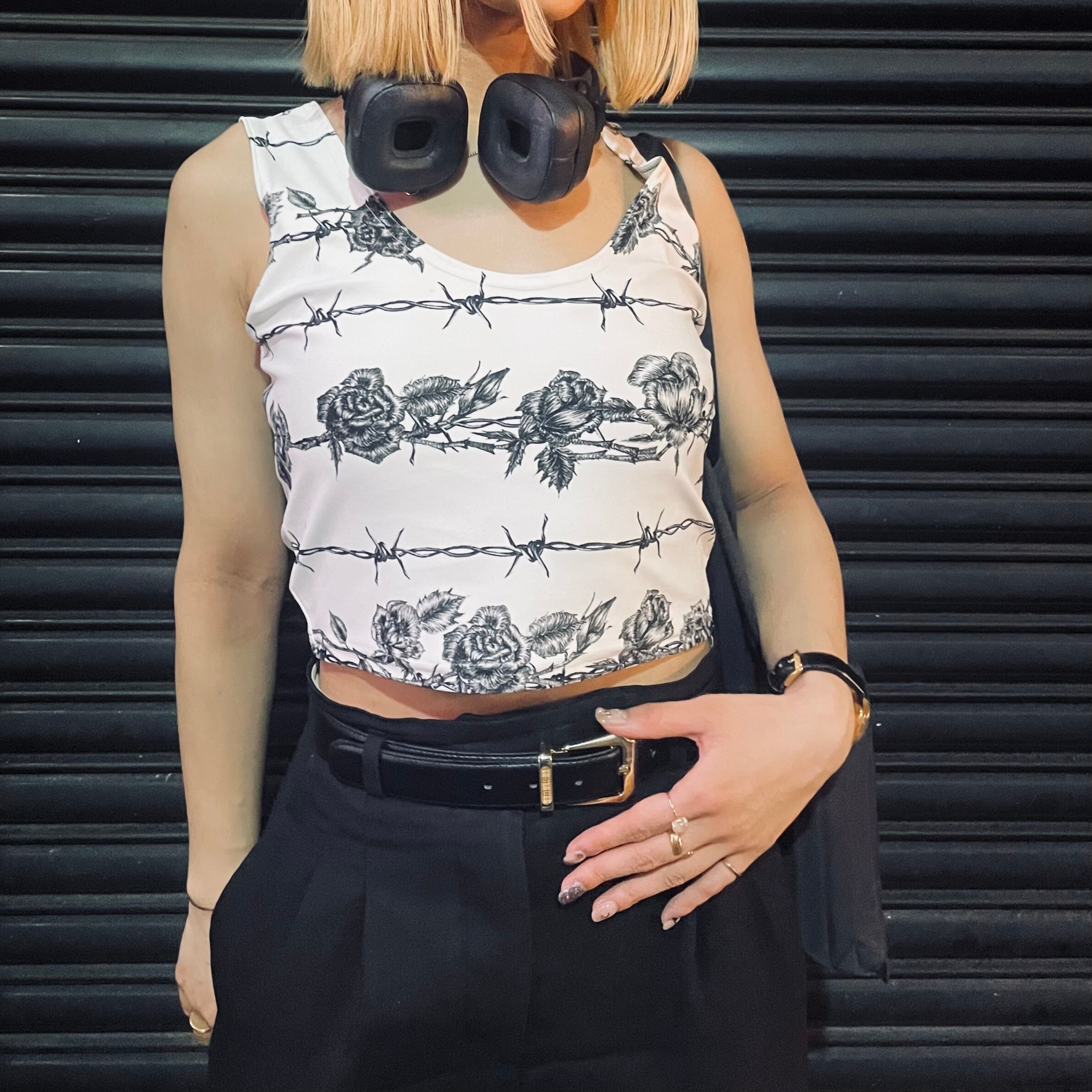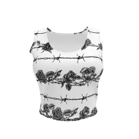 ボールペン画でデザインをおこした薔薇と有刺鉄線柄のクロップタンクトップ。