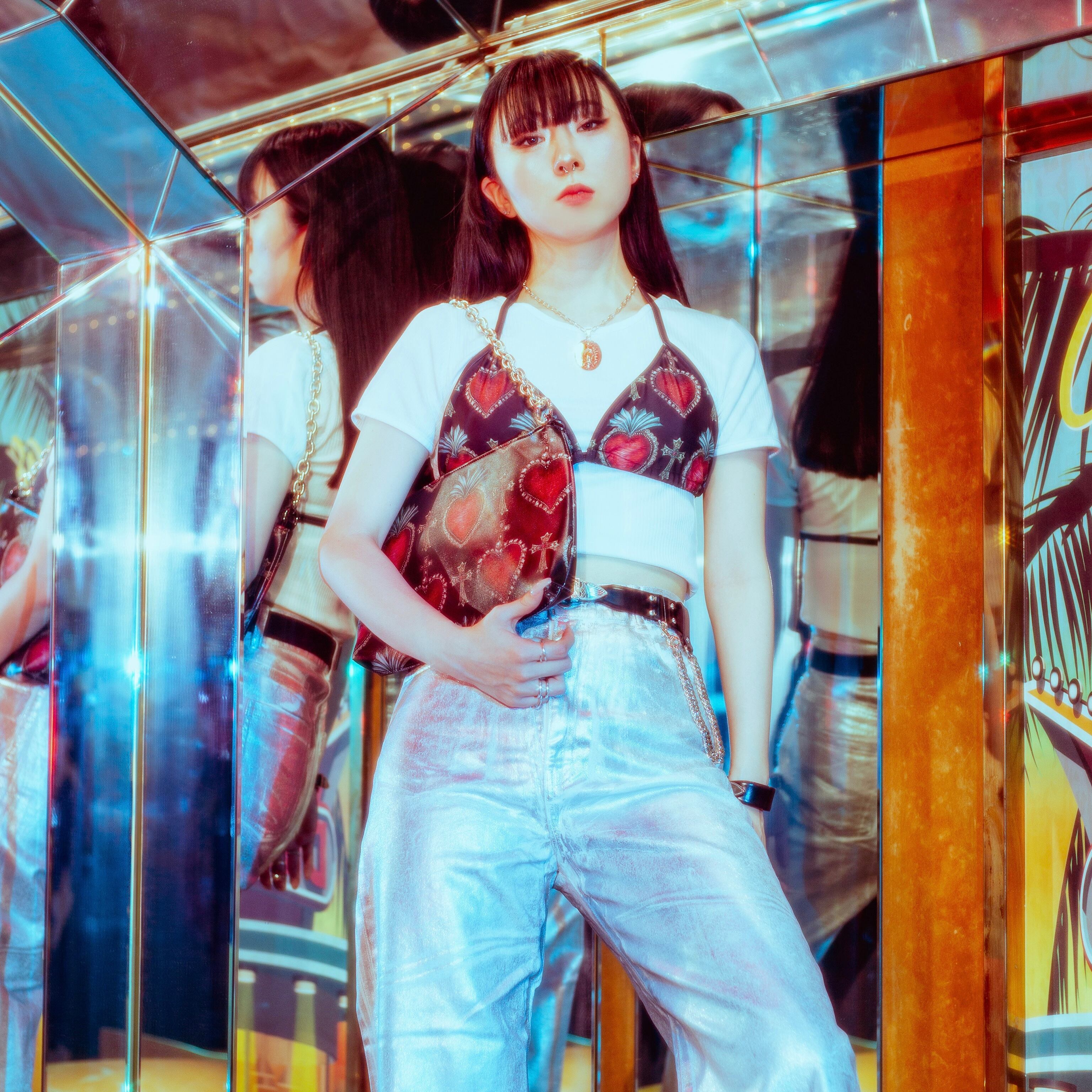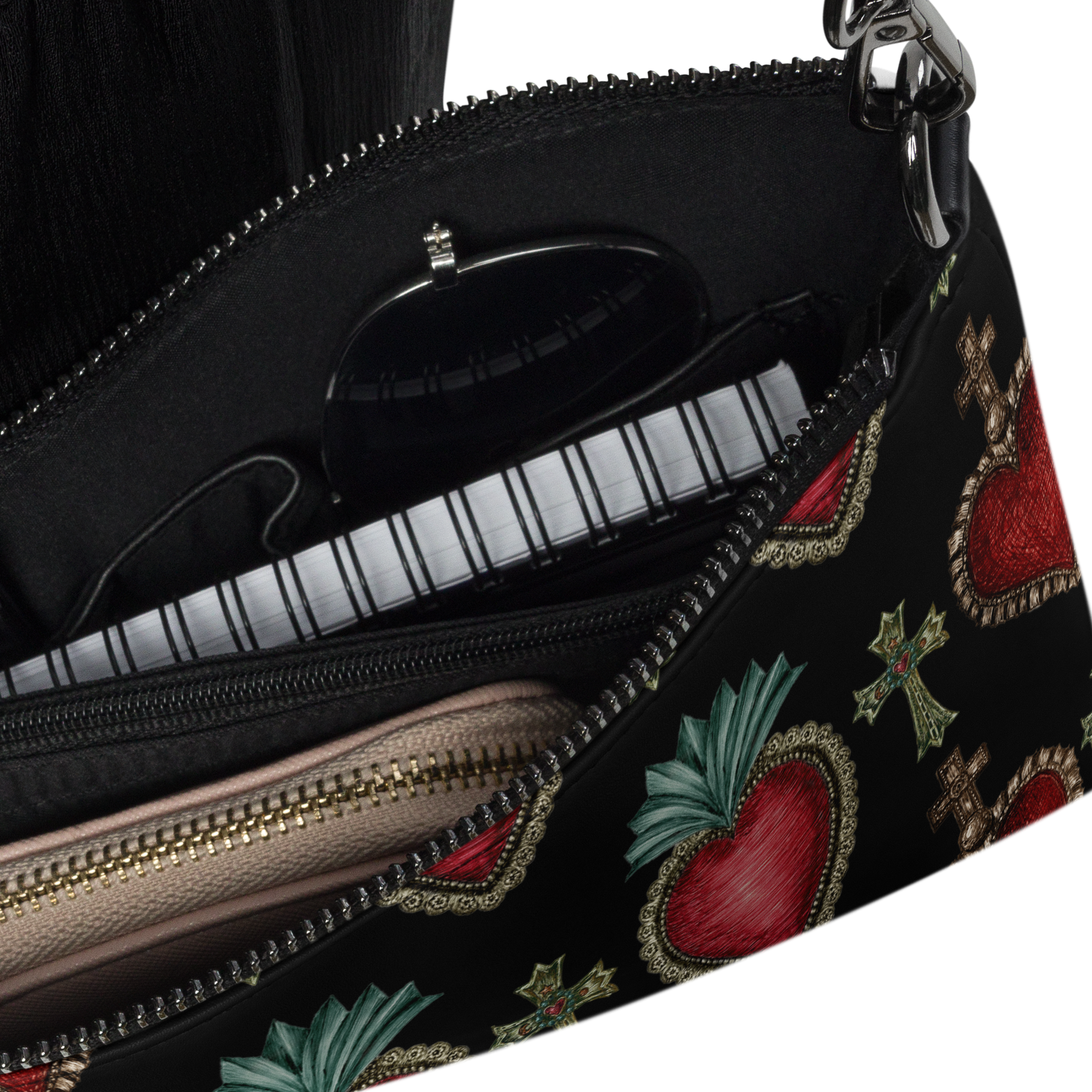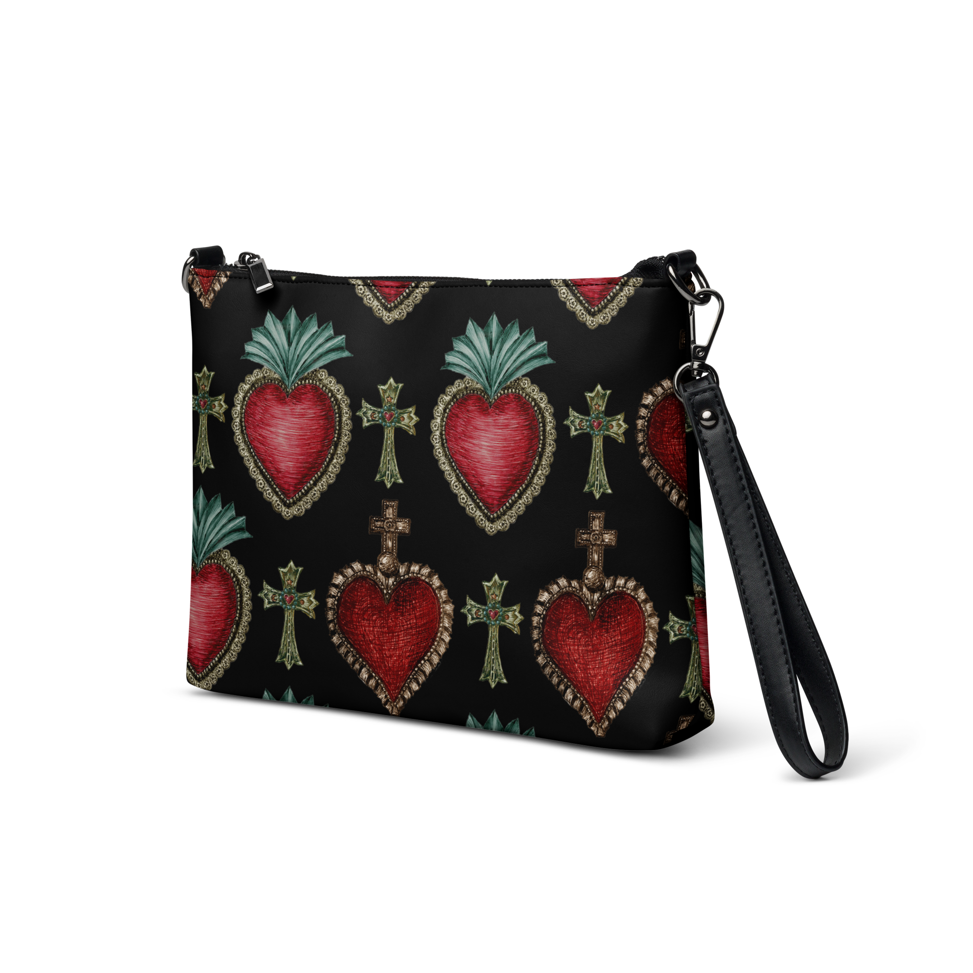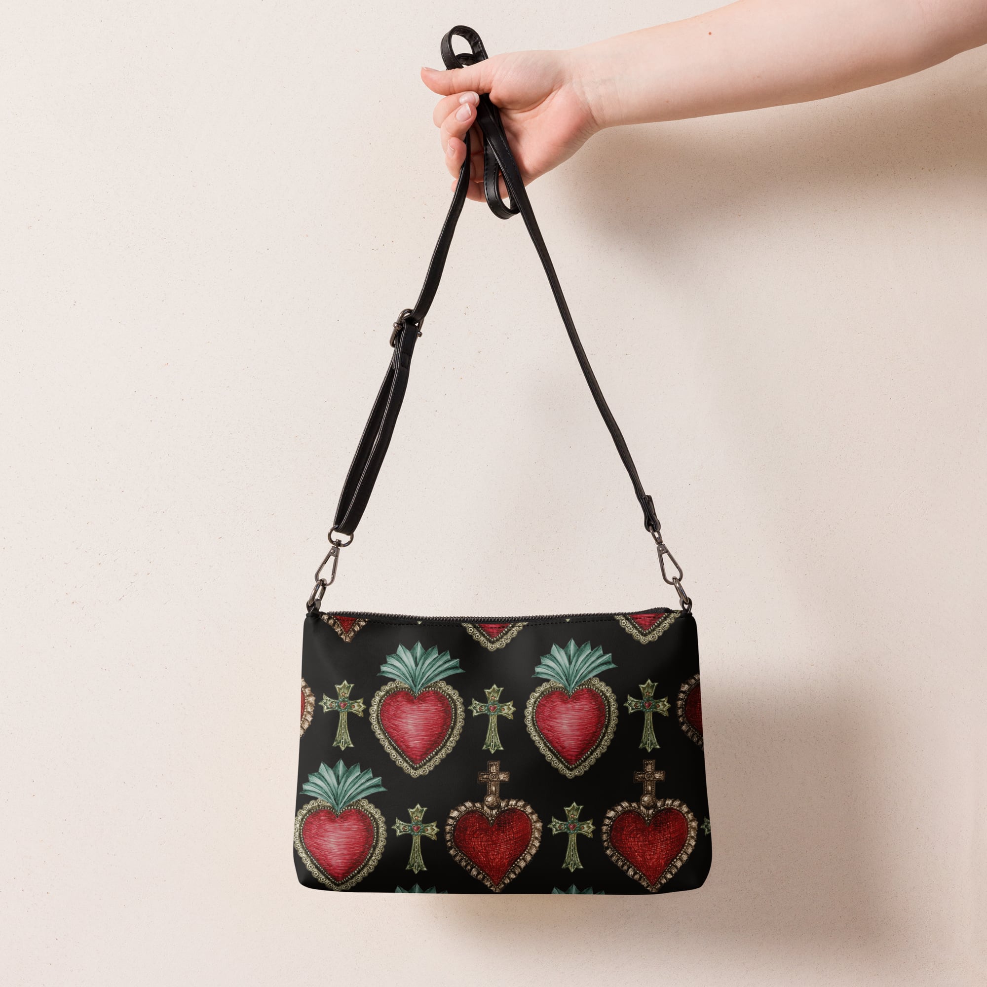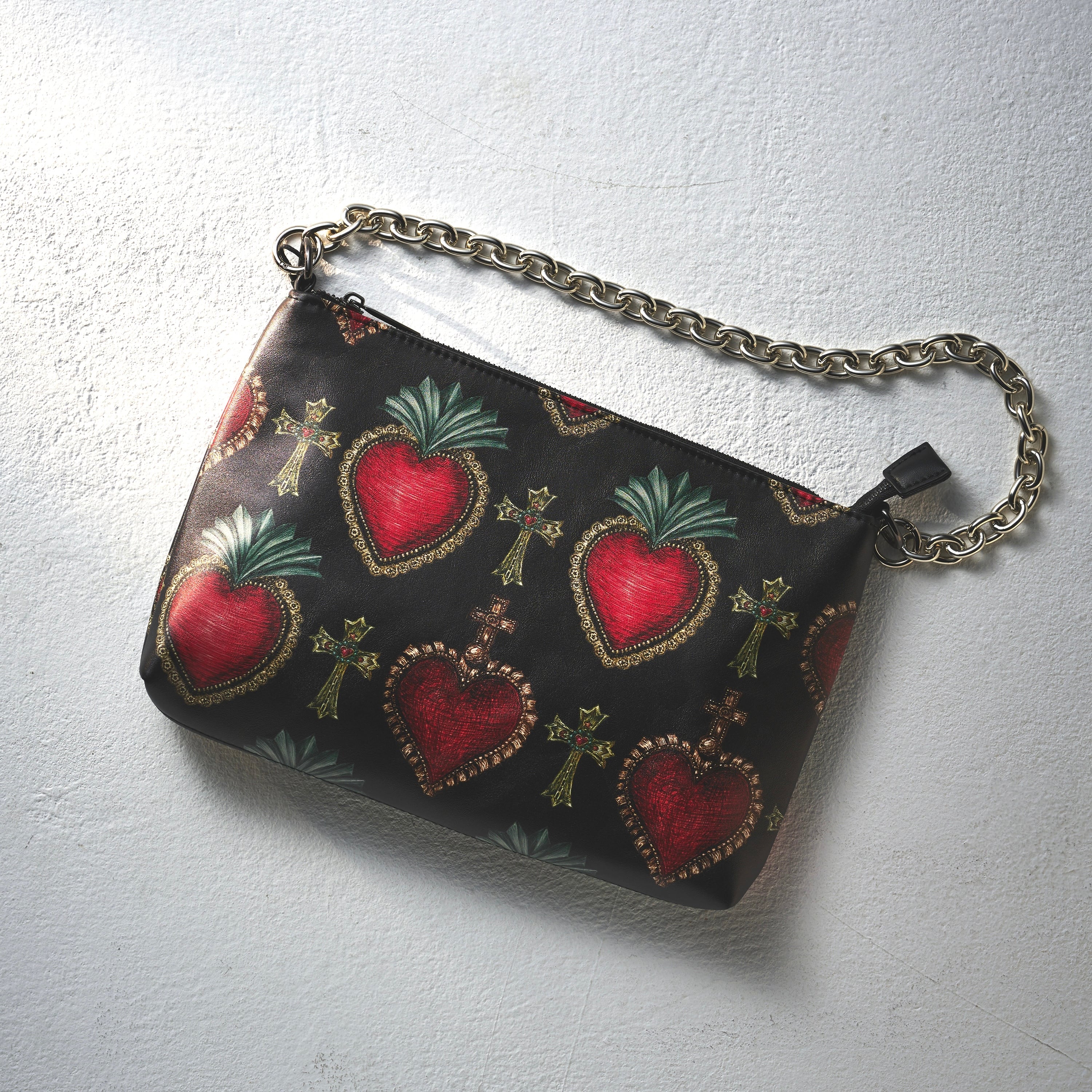 クラシックなシルエットが特徴のオリジナルショルダーバッグ。コラソンの柄が個性的でスタイリッシュなデザイン。